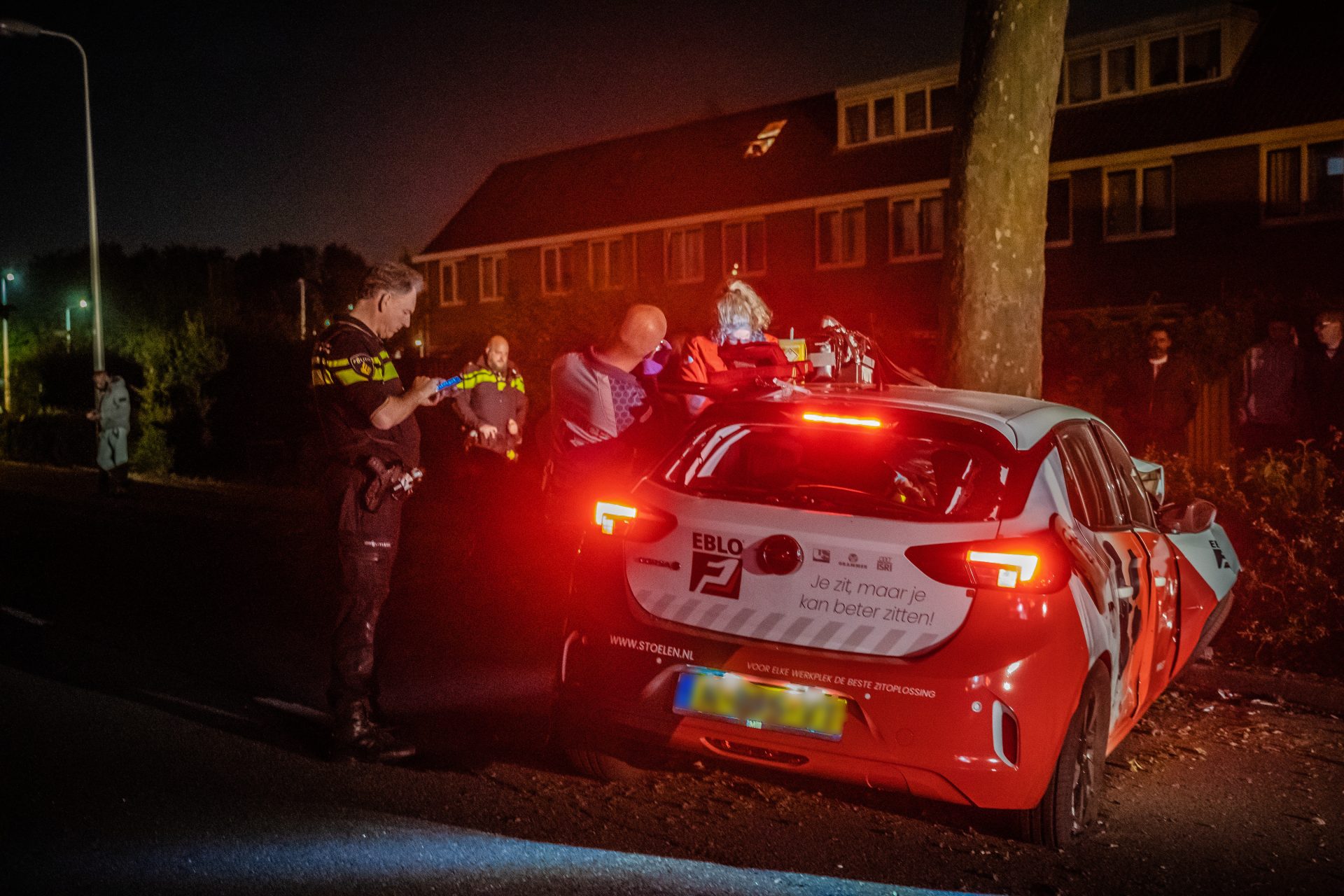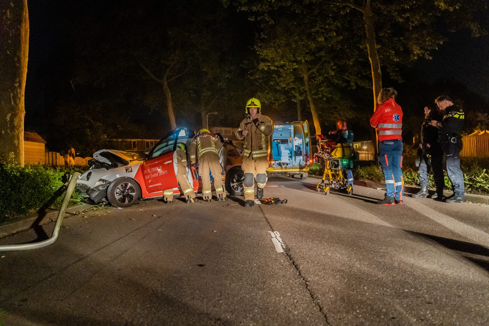 De auto waarschuwde zelf via het E-call systeem de hulpdiensten. Ambulancepersoneel verzocht de brandweer ter plaatse te komen omdat het om een elektrisch voertuig ging. Deze moet eerst spanningsvrij worden gemaakt voordat de patiënt uit de auto kan worden gehaald.
