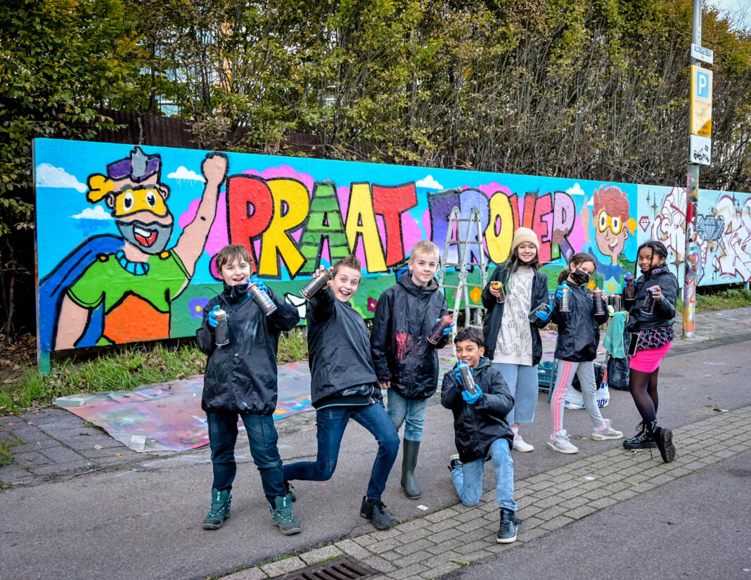 Het kindercollege maakte deze week samen met Graffiti Pro een kunstwerk op de graffitimuur tegenover het gemeentehuis. De graffitikunst moet voorbijgangers stimuleren om te praten over het onderwerp.