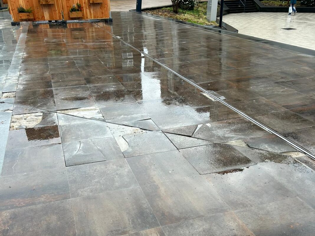 De gemeente stak in december 2020 al de hand in eigen boezem en verving de net geplaatste tegels voor een grovere variant. Nu ruim twee jaar later zijn de tegels op het gedeelte bij de winkels nog altijd niet vervangen. En dat zorgt nog steeds voor veel klachten en glijpartijen in de winterse maanden. Daarnaast zorgen de scherpe losliggende stukken voor gevaarlijke situaties.