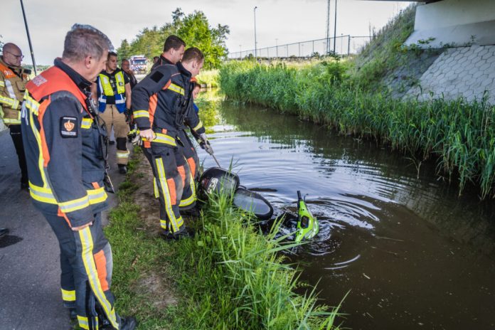 De brandweer heeft de scooter uit het water gehaald en langs de kant geplaatst.
