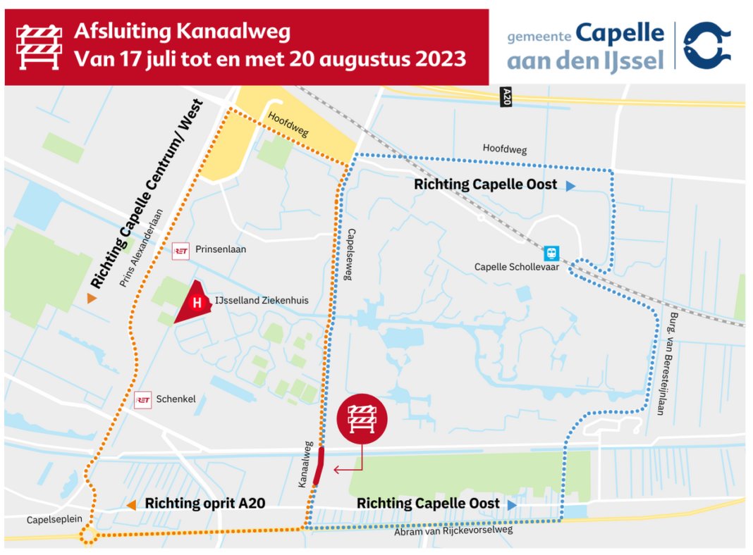 Van maandag 17 juli tot en met zondag 20 augustus is de Kanaalweg in beide richtingen afgesloten voor gemotoriseerd verkeer. Voor fietsers en voetgangers blijft de Kanaalweg met een kleine omleiding wel toegankelijk.