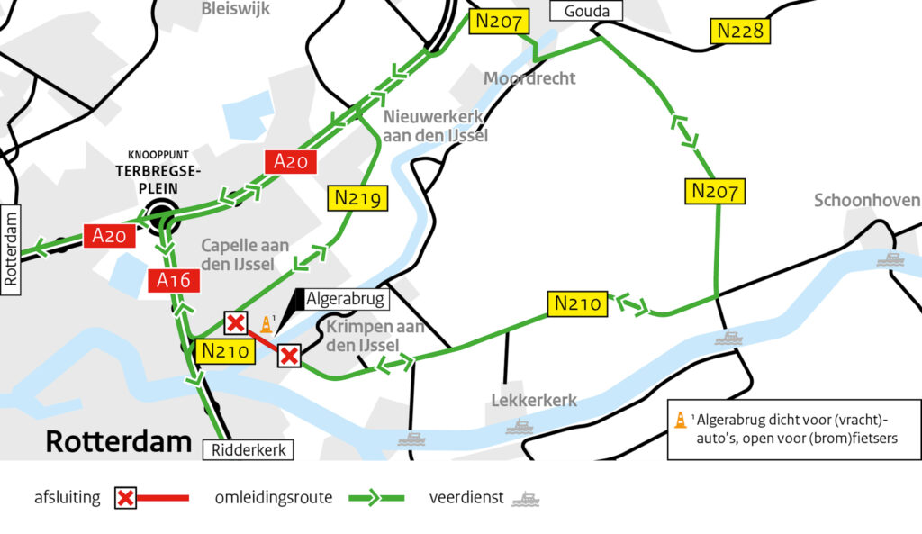 Voor autoverkeer betekent de afsluiting een lange omleidingsroute. Verkeer wordt omgeleid via de N210 en N207 richting Gouda en vervolgens via de A20 en N219, of in tegengestelde richting.