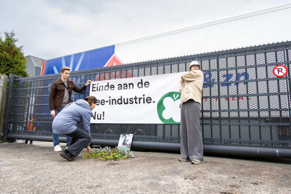 “We zijn hier om een vuist te maken tegen de vreselijke bio-industrie”, legt Falco van Hassel uit. “We zien dat elk jaar in Nederland vijfhonderd miljoen dieren worden gefokt en gedood. In dit kalverslachthuis worden heel veel kalfjes geslacht. Die zijn weggehaald bij hun moeder, worden vetgemest en belanden in dit slachthuis. Daar zijn we op tegen.”