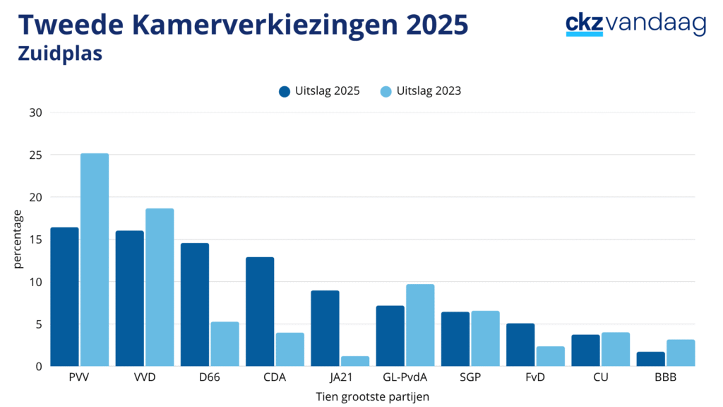 Vergelijkbaar als met andere gemeenten heeft de PVV flink ingeleverd. Toch is deze partij in Zuidplas met 4837 stemmen (16,4%) wederom de grootste geworden. Vlak daarachter staat de VVD met 4715 stemmen (16,0%). D66 (14,6%) en CDA (12,9%) staan op de derde en vierde plek.