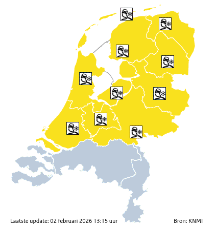 De waarschuwing geldt met name voor in het noorden van het land, maar ook in het midden kan het glad worden. In Zuid-Holland is code geel van kracht tussen 12.00 en 17.00 uur. In het noorden kan de gladheid tot woensdagochtend aanhouden.