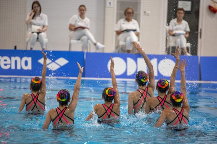 De zwemsters geven hun opvoering ten overstaan van de jury
